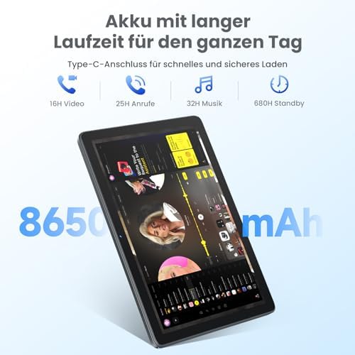 🔋 【8650mAh Akku Tablet mit USB-C】 Der ZONKO Tablet große 8650-mAh-Akku bietet eine lange Akkulaufzeit: bis zu 680 Stunden Standby, 12 Stunden Spielen, 16 Stunden Videogespräche und 32 Stunden Musikwiedergabe – Perfekt für Reisen als Entertainment Tablet. Schnellladung per USB-C – Weniger Wartezeit.