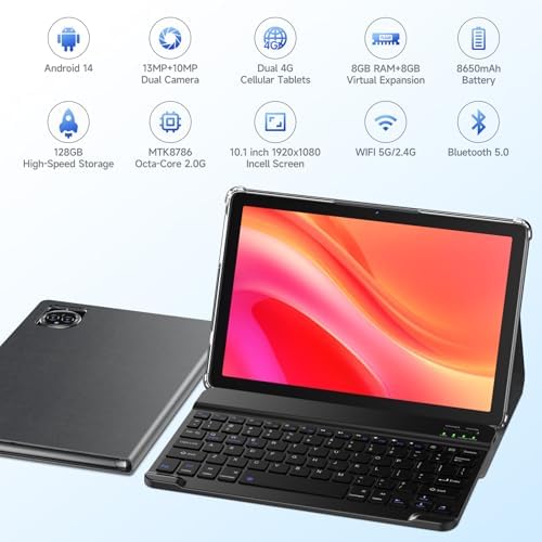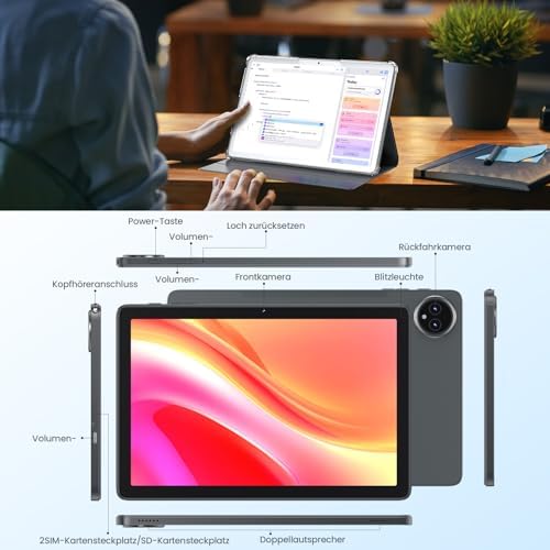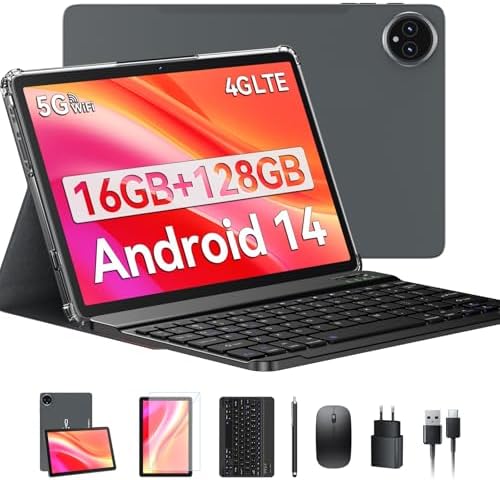 2025 Neuester 10,1 Zoll Tablet mit Android 14 – 16GB+128GB Speicher (1TB TF), 4G LTE mit 2 SIM & 1 SD Slot, 5G & Wifi, O
