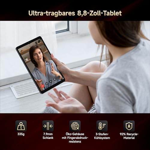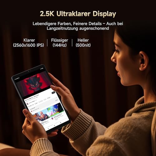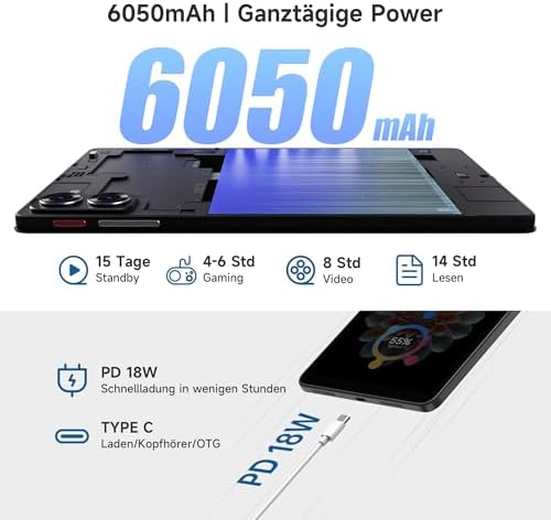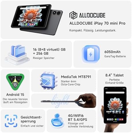 Das kompakte ALLDOCUBE iPlay 70 mini Pro Tablet passt gut in jede Tasche und eignet sich perfekt für Gaming und Streaming. Der große 6050 mAh-Akku ermöglicht bis zu 10 Stunden Videowiedergabe. Mit nur 7,3 mm Dicke und 350 g Gewicht liegt das 8,4 Zoll-Tablet perfekt in der Hand.