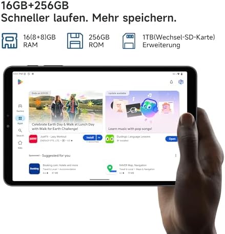 Dank 16 GB RAM (8 GB physisch + 8 GB erweitert) schaltet sich das ALLDOCUBE mini-Tablet ohne Probleme zwischen mehreren Apps. Der 256 GB UFS-Speicher bietet genügend Platz, erweiterbar auf 1 TB via microSD-Karte. Perfekt für Fotos, Videos und Dokumente.