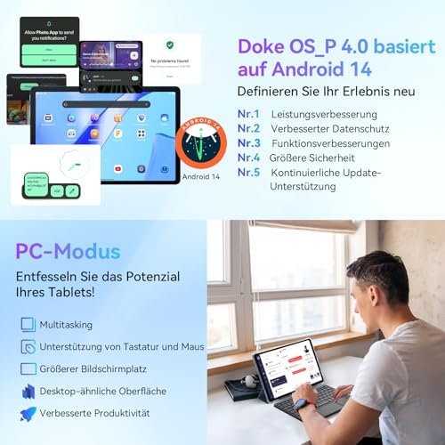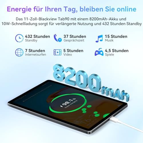 Das 11-zentimeterige Blackview Tab90 mit DokeOS_P 4.0 läuft auf Android 14. Dieser Tablet bietet glatte Betriebsfähigkeit und eine benutzerfreundliche Interaktion. Durch umfangreiche Verbesserungen in Geschwindigkeit, Sicherheit und Datenschutz wurde die Performance signifikant verbessert. Die 8200-milliäher-Batterie bietet eine lange Dienstzeit und erlaubt es Ihnen, Musik, E-Books und Videos den ganzen Tag lang zu genießen. Mit dieser Batterie verabschieden Sie sich von der Angst vor Batterieausfälle, und das Tab90 ist GMS-zertifiziert.