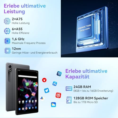 Das 24-GB-RAM-Tablet mit 8-Kern-T606-Prozessor (2 A75 und 6 A55 Kerne) bietet schnelle Programmstart- und Transfereffizienz. Die 128-GB-Inneren Speicher ermöglichen es Ihnen, genügend Platz für Spiele, E-Books und Videos zu haben. Bis zu 2-GB-SD-Card Support ergänzt das, was Sie brauchen.