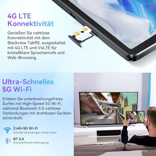 Das Blackview Android 14-Tablet kombiniert Funk- und WLAN-Funktionen in einem Gerät. Zwei SIM-Karten-Slots ermöglichen es Ihnen, 4G LTE für Anrufe und mobile Internet zu nutzen, sodass Sie auch ohne WLAN Online bleiben. Perfekt für Reisen. Es hat 2,4-Gigahertz/5-Gigahertz-Wi-Fi, Bluetooth 5.0 und erkennt automatisch die stabilste Signalkraft – für eine kluge Benutzererfahrung. GPS, B1C, GLONASS und Galileo ermöglichen es Ihnen, das Tab90 auch als Navigationsterminale zu nutzen.