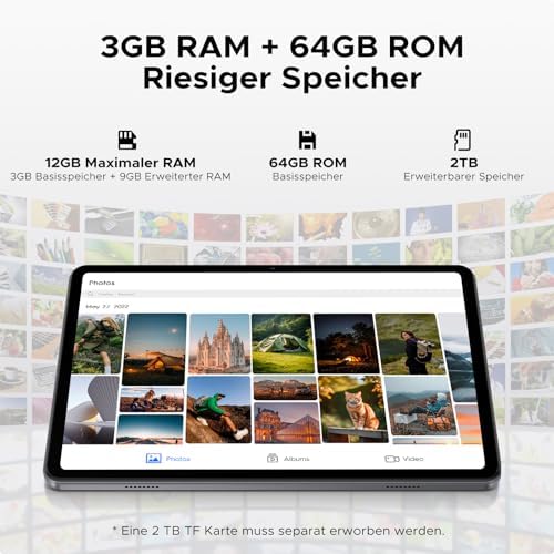 Der DOOGEE Tab A9 Tablet mit Tastatur ist mit 12GB RAM ausgestattet, darunter 3GB Basismemory und 9GB erweiterbare Speicher. Dieses DOOGEE Tab A9 Tablet 10 Zoll läuft mit dem neuesten Android 15 System glatt. Es verfügt über zwei Lautsprecher und einen HD IPS-Schirm, damit Sie den ultimativen visuellen und akustischen Erfahrung genießen können. Die 64GB-internen Speicher können über Micro SD auf 2TB erweitert werden.