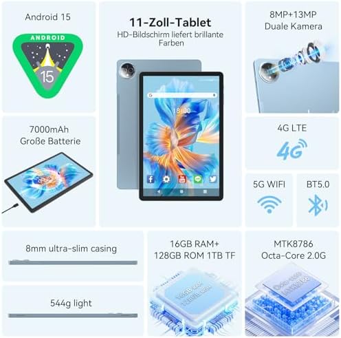 Mit 16GB (8GB Physical + 8GB Virtual) RAM und 128GB internem Speicher, unterstützt das Tablet bis zu 1TB erweiterbare Speicher (SD/TF Karte nicht enthalten), um all Ihre Apps, eBooks, Filme, Fotos, Videos und Spiele zu halten.