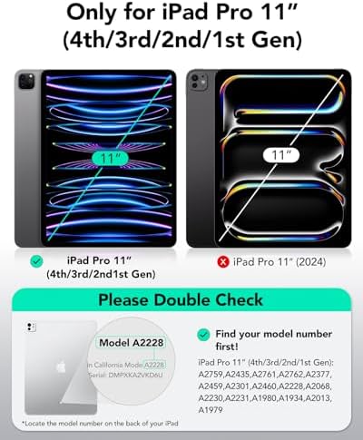 Die Hülle ist für iPad Pro 11 Zoll (2022, 4. Generation), iPad Pro 11 Zoll (2021, 3. Generation) und iPad Pro 11 Zoll (2020, 2. Generation) sowie folgende Modelle entwickelt: A2759, A2435, A2761, A2762, A2377, A2459, A2301, A2460, A2228, A2068, A2230, A2231.