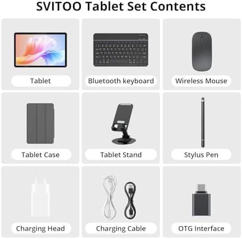 Das SVITOO Android 15 10-Zoll-Tablet kommt mit vollständigem Set: Tastatur, Maus, Stift und 6 weitere Accessoires. Der gesunde Geschenkkarton mit 1-jahrigen Garantie und 24/7 Kundenunterstützung macht das Gerät zum perfekten Teil deines Lebens oder für deinen Arbeitsplatz.