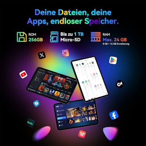 Das Android 15-Tablet bietet ein intelligentes, sicheres und nahtloses Nutzererlebnis. Mit 24 GB RAM (erweiterbar auf 24 GB) und 256 GB UFS-Speicher (erweiterbar auf 2 TB über TF-Karte) haben Sie die Leistung und den Speicherplatz, um mühelos zwischen Apps zu wechseln, massive Dateien zu speichern und anspruchsvolle Spiele ohne Verzögerungen zu genießen.