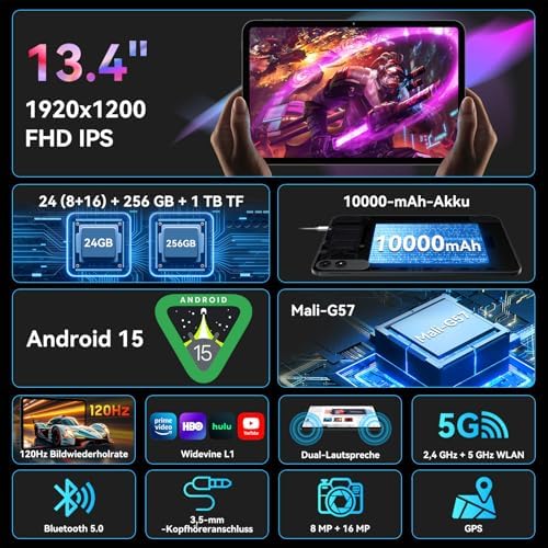 Tauchen Sie ein in ein riesiges 13,4-Zoll FHD+ Display (1920×1200) mit 34 % mehr Sichtfläche als standardmäßige 10-Zoll-Tablets. Dank der 120-Hz-Bildwiederholrate und 180-Hz-Touch-Abtastung reagiert das Display auf jede Berührung blitzschnell – für atemberaubend flüssiges Spielen. Ob Sie Filme ansehen, im Internet surfen oder strategy Spiele spielen – es ist ein visuelles Erlebnis mit messerscharfer Klarheit.