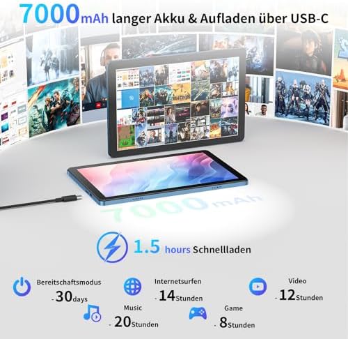7000mAh lange Laufzeit für den ganzen Tag: Dank der leistungsstarken 7000mAh Batterie können Sie sich den ganzen Tag lang auf Ihr Tablet verlassen. Perfekt für unterwegs, beim Reisen oder beim täglichen Gebrauch – ob beim Streamen von Videos, Lesen von E-Books oder Arbeiten an Projekten, sorgt der Akku für eine lange Betriebsdauer ohne häufiges Aufladen.