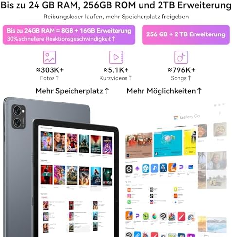 24GB RAM + 256GB ROM + 2TB ERWEITERUNG: TABWEE T20 Tablet 10 zoll kombiniert 8 GB integrierten Arbeitsspeicher mit innovativer RAM-Erweiterungstechnologie für bis zu 24 GB – flüssiges Gaming, Perfektion beim Multitasking und verbesserte Leistung. Mit 256 GB interner Speicherkapazität und erweiterbarem 2 TB-Speicher via TF-Karte bieten wir Platz für Filme, Fotos, Projekte und kreative Inhalte – ideal für Content-Ersteller und Power-User.