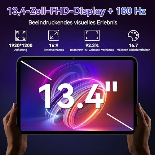 Atemberaubendes 13,4 Zoll Tablet mit 120Hz Display – Genießen Sie kristallklare, flüssige Bilder auf dem 13,4-Zoll FHD-Screen (1920×1200) mit 92,3% Bildschirmanteil und 16,7 Millionen Farben für ein absolut immersives Seherlebnis. Die hohe Bildwiederholrate von 120 Hz sorgt für flüssiges Scrollen, gestochen scharfe Bilder und ein atemberaubendes Multimedia-Erlebnis – perfekt für Arbeit, Entertainment und kreative Projekte.