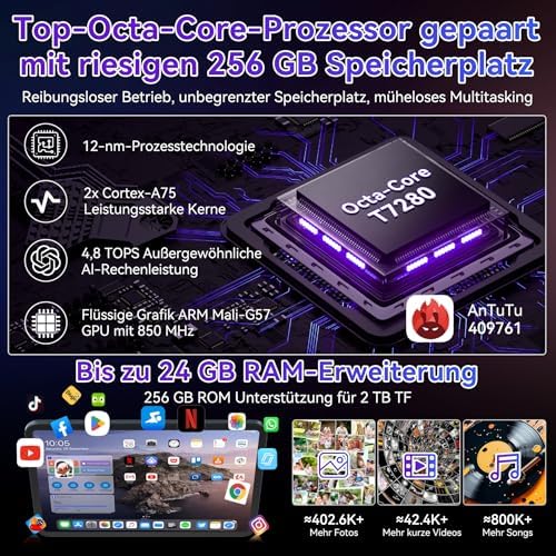 Leistungsstarkes Octa-Core Tablet mit Tastatur – Erfahren Sie reibungsloses Multitasking mit 24 GB RAM (8+16 GB erweiterbar) und 256 GB ROM (erweiterbar auf 2 TB). Genießen Sie scharfe HD- und HDR-Inhalte auf Netflix & Prime Video dank Widevine L1 und GMS-Zertifizierung. Das komplette Paket für maximales Entertainment und Produktivität – inklusive praktischer Tastatur.